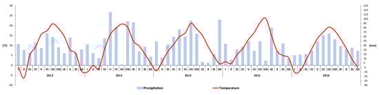 The trial was set up in spring 2012 and covered five growing seasons. The study was conducted in the experimental orchard of the Warsaw University of Life Sciences, Wilanów, Poland. The plant material consisted of apple Malus × domestica Borkh. cultivar ‘Gold Chief’ grafted on M.9 rootstock. Trees were planted in 3.5 × 1.4 m spacing in deep, loamy alluvial soil, with 2.5% of humus. Trees were trained in a spindle-bush system. The weather conditions during the course of the trial are presented in Figure 1. Data were collected during the experiment using the Davis Vantage Pro 7 field weather station installed in the experimental orchard.