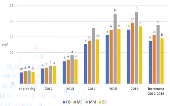 Trunk cross-section area (TCSA) and TCSA increment of apple tree cv. Gold Chief using different soil management systems during 2012–2016. HS: Herbicide strip; MC: Mechanical cultivation; MM: Miscanthus spp. mulch; BC: Black polypropylene woven ground cover. * means followed by the same letter within a year do not differ significantly according to the Newman–Keuls test at p < 0.05.