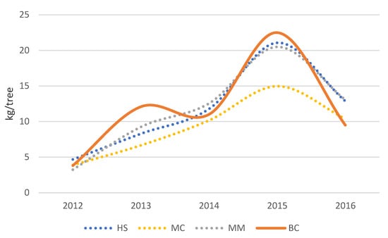 The cumulative yield from 2012–2016 was similar for the HS, MM, and BC systems and was significantly higher compared to the MC system (Table 1). The crop efficiency index was significantly higher for both HS and BC than for MC. It corresponded to the highest values, which were observed in HS and BC plots, while the lowest was noted for MC (Table 1). It was observed that the BC treatment had a negative effect on the uniformity of fruiting between years; thus, it contributes to biennial bearing. The biennial bearing index was significantly lower under MC in comparison to BC (Table 1, Figure 3).