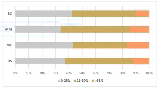 The lowest percentage of the least colored fruit was recorded for both HS and MM, and it was 37.2% and 33.9%, respectively (Figure 4). Moreover, both MM and MC were the combinations with the highest percentage of fruit with a blush covering >50% of the skin surface of the fruit (Figure 4).