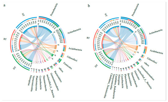 The relative abundance of dominant phyla in the 0 to 20 cm layer with no tillage (NT), rotary tillage (RT), and deep tillage (DT) (the average relative abundance > 1%) during the (a) wheat and (b) maize seasons.