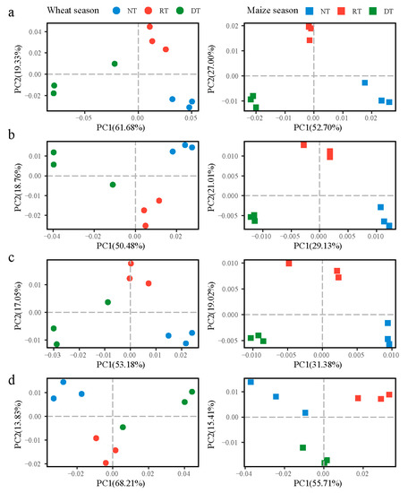 Principal co-ordinate analyses of variation among the (a) NR database; (b) eggNOG database; (c) KEGG database, and (d) CAZy database gene profiles based on Bray–Curtis distances. The relative abundance of dominant phyla in the 0–20 cm layer with no tillage (NT), rotary tillage (RT), and deep tillage (DT). The left charts represent the wheat season, and the right charts represent the maize season.