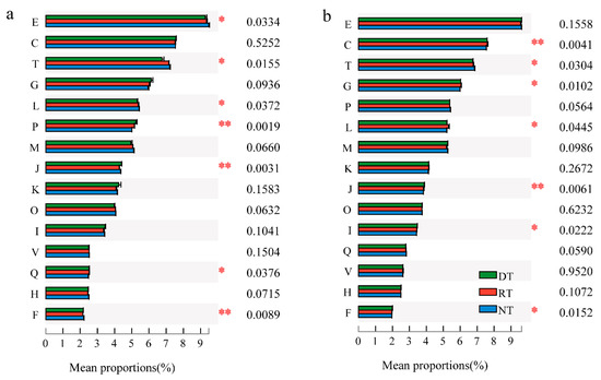 Analyses of function-related differences focused on clusters of orthologous groups of proteins (COG) using the evolutionary genealogy of genes: non-supervised orthologous groups (eggNOG) represented the top 15 of all COGs under different treatments in the (a) wheat and (b) maize seasons. E, Amino acid transport and metabolism; C, Energy production and conversion; G, Carbohydrate transport and metabolism; T, Signal transduction mechanisms; L, Replication, recombination and repair; P, Inorganic ion transport and metabolism; M, Cell wall/membrane/envelope biogenesis; J, Translation, ribosomal structure, and biogenesis; K, Transcription; O, Post-translational modification, protein turnover, and chaperones; I, Lipid transport and metabolism; V, Defense mechanisms; Q, Secondary metabolite biosynthesis, transport and catabolism; H, Coenzyme transport and metabolism; F, Nucleotide transport and metabolism. *, ** mean significant difference among treatments at p = 0.05, 0.01, respectively.
