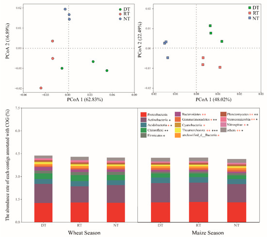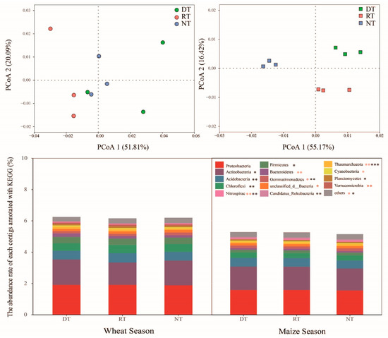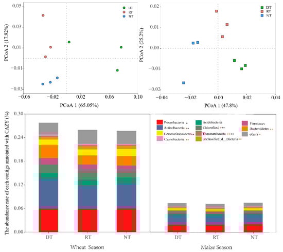 To confirm the functional profiles, individual genes annotated by KEGG2 were summarized, as shown in Figure 5. Compared with NT treatment, the relative abundance of carbohydrate metabolism pathway genes was increased under DT and RT treatments in the maize season (p < 0.05, Figure 5). In both the wheat season and the maize season, the carbohydrate metabolism pathway was dominated by Proteobacteria, Actinobacteria, Acidobacteria, Chloroflexi, Firmicutes, Bacteroidetes, Gemmatimonadetes, Thaumarchaeota, Cyanobacteria, Planctomycetes, Verrucomicrobia, Nitrospirae, Candidatus_Rokubacteria, and unclassified_d_Bacteria (Figure 6). These taxa accounted for more than 93% of the metabolism pathway genes in all treatments. PCoA analysis showed that samples within each treatment in the maize season clustered tightly together but were differentiated between different treatments (Figure 6). Compared with NT treatment, in the maize season, the relative abundances of Actinobacteria, Acidobacteria, and Chloroflexi in DT treatment increased by 7.26%, 6.87%, and 8.24% respectively (p < 0.05, Figure 6). There were no differences in Proteobacteria abundance across all treatments (Figure 6, p > 0.05).