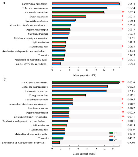 Analyses of the function-related differences focused on pathway level 2 using KEGG provided the top 15 represented pathways under different treatments in the wheat (a) and maize (b) seasons. *, ** indicate significant difference among treatments at p = 0.05, 0.01, respectively.