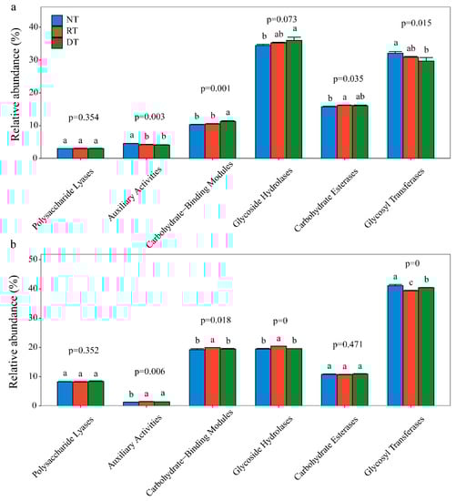 The variation of carbohydrate-active enzymes (CAZy) Database gene class profiles under different tillage methods. Values are the means ± standard deviation (n = 3). (a) represents the wheat season, and (b) represents the maize season. Different letters in the figures indicate significant differences tested by Duncan’s multiple comparison.