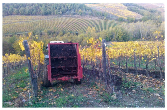 Compost produced in farm using manure, pruning residue, grape stalks, and marc, distributed by a manure spreader within a vineyard characterized by eroded and scarcely fertile soils.
