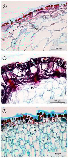 The major group of polyphenols presented in assayed species represent pigments—anthocyanins. The pigments causing the color of the fruits significantly affects their transmission by animals [31]. Unfortunately, the majority of studies deals with well-known fruit species. In many plant species, the pigments are localized mostly in the skin of the fruit. The density of red pigments in cells of the outer layer of the fruit skin red apple “Fuji” is responsible for the color of the fruits [32]. The cells with colored vacuoles were observed in the epidermal and subepidermal cells in the maturing fruit of Empetrum nigrum. Konarska noticed that The the phenolic compounds localized mainly in the epidermal and hypodermal cells in the mature fruits of Prunus domestica cultivars [33]. The anthocyanins in the mature berries of Vitis vinifera DeChaunacwere localized in a shallow subepidermal layer, while they were not detected in the epidermis [34]. The accumulation of bioactive compounds has been important for the further utilization of the fruit.