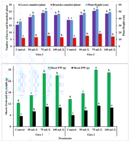 The exogenous application of different concentrations of AYE (50, 75 and 100 mL L−1) on two cultivars of lupine (Giza 1 and Giza 2) substantially increased the examined growth attributes compared with untreated plants (Figure 1). However, the concentration of 75 mL L−1 AYE showed the most substantial increases in shoot length (43.7% and 42.7%), number of leaves (54.8% and 34.2%), number of branches (25.1% and 50.0%), shoot fresh weight (124.0% and 106.9%), and shoot dry weight (90.9% and 83.3%) for Giza 1 and Giza 2 cultivars, respectively followed by 100 mL L−1 AYE in comparison to untreated plants, as well as Giza 2 showed higher increases than Giza 1.
