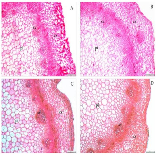 Effect of four AYE exogenous applications on stem anatomy of two lupine cultivars grown in reclaimed-saline soil. (A) = Control (Giza 1); (B) = Control (Giza 2); (C) = 75 mL AYE L−1 (Giza 1); (D) = 75 mL AYE L−1 (Giza 2); cx = cortex; xv = xylem vessel; Pi = Pith; Scale bar = 200 μ.