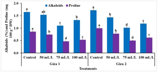 Effect of four AYE exogenous applications on alkaloids and proline of two lupine cultivars grown in reclaimed-saline soil. For each parameter, treatments followed by the same letter are not significantly differed at p ≤ 0.05. Error bars are ± Standard Error (SE).