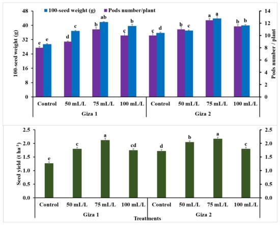 All foliar-applied AYE levels (i.e., 50, 75, and 100 mL L−1) significantly improved the yield of the two lupine cultivars and its components compared to those obtained from untreated lupines (Figure 6). The AYE concentration of 75 mL L−1 was the most influential followed by 100 mL L−1 AYE, and it surpassed the control results for Giza 1 and Giza 2 cultivars by 37.5% and 41.8% for dry pods per plant, 66.9% and 25.0% for average 100-seed weight and 22.6% and 31.2% for dry seed yield per hectare, respectively. The Giza 2 cultivar showed a higher increase than the Giza 1 cultivar.