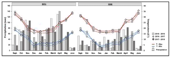 Field experiments were conducted from 2015 to 2018 at two sites in the North-west of Tunisia: the Beja El Gnadil site (denoted by BEG) (36°7258′ N, 9°3043′ E) and the Siliana Bourouis site (denoted by SBR) (36°2098′ N, 9°0665′ E) (Figure S1). Agronomic characteristics and soil physicochemical properties are given in the Supplementary Table S1. At both sites, farming practices were conventional based on cereal-legume rotation, with a predominance of cereal crops where the previous crops before the experimental trials was oats (Avena sativa L.). Generally, in the north-west of Tunisia, chemical input management in conventional cereal crops relies mostly on the use of herbicides and N-fertilizers, about 90 to 120 kg ha−1 of N-fertilizer for durum wheat [22]. The BEG site has a sub-humid climate while the SBR site has a semi-arid climate. Agricultural production at both sites depends only on natural precipitation. Figure 1 shows data on environmental conditions (monthly precipitation and temperature) for the three experimental seasons. Precipitation varied greatly between both sites but was generally similar between the three experimental seasons. At BEG site, the climate was rainy weather with an average annual precipitation of 621.1 mm, 646.3 mm and 595.3 mm respectively during 2015–2016, 2016–2017 and 2017–2018 seasons. However, at SBR, the climate was semi-arid with an average annual precipitation of 364 mm, 332.2 mm and 355.2 mm respectively during 2015–2016, 2016–2017 and 2017–2018 seasons. The minimum temperature seldom drops below 0 °C during winter, so no frost damage was observed in legumes which are less frost-resistant than cereals (Figure 1).