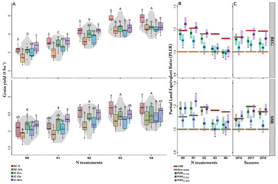 Durum wheat grain yield and PLER at both sites. (A) Grain yield affected by N treatment (Violin plot) and cropping pattern within each N treatment (Box plot) averaged over the three seasons; Violin plots headed by a common capital letter are not significantly different at p < 0.05 according to Tukey’s HSD-test. Within each violin plot, box plots with a common lowercase letter are not significantly different at p < 0.05 according to Tukey’s HSD-test (for statistical output see Table S3). (B): PLER of the three intercropping patterns compared to the herbicide response ratio (HRR) in each N treatment averaged over the three seasons; (C): PLER of the three intercropping patterns compared to the herbicide response ratio (HRR) in each season averaged over the five N treatments; In (B,C) panels, PLER: partial land equivalent ratio-yield in intercrop divided by yield in sole crop with no herbicide; HRR: herbicide response ratio-yield in sole crop with herbicide divided by yield in sole crop with no herbicide; Orange lines indicate a relative yield of one, i.e., with yield equal to that of a sole durum wheat with no herbicide; Red lines indicate the HRR; Tiles represent the means PLER and 95% confidence intervals of each intercropping pattern; Top asterisk (*) indicates a significant increase and bottom asterisk indicates a significant decrease compared to the HRR (Tukey-test, α = 0.05).