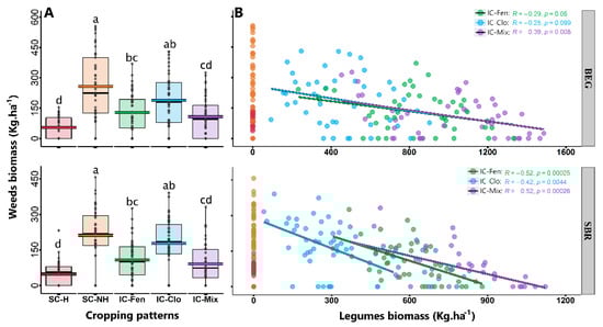 Effect of cropping patterns on weed biomass, averaged over the three seasons and the five N treatments (A) and the relationship between weed biomass and legume biomass in each intercropping pattern (B) at both sites.(A): Box plot indicating the cropping pattern effects on the weed biomass averaged over the three seasons and the five N treatments (Colored lines indicate the mean); Box plots with a common letter are not significantly different at p < 0.05 according to Tukey’s HSD-test. (B): Relationship between weeds biomass and legumes biomass in each intercropping pattern (R-values are the correlation coefficient (Spearman’s correlation); colored lines represent linear regression for each intercropping pattern).