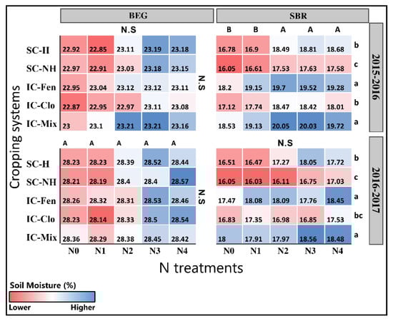 Effects of cropping pattern and N treatment on soil moisture at legumes flowering in 2016 and 2017 seasons, at both sites. Capital letters (A, B) indicate significant differences between N treatments (cropping patterns combined), according to Tukey’s HSD-test. Lower-case letters (a, b, c) indicate significant differences between cropping patterns (N treatments combined), according to Tukey’s HSD-test. N.S. not significant.