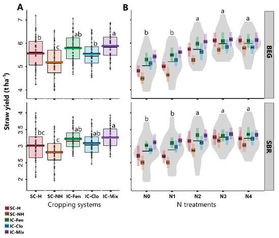 Effects of cropping pattern and N treatment on the straw yield at both sites averaged across the three experimental seasons.(A): Box plot indicating the cropping pattern effects on the straw yield averaged over the three seasons and the five N treatments;(B): Violin plot indicating the N treatment effects on the straw yield averaged over the three seasons and the five cropping patterns (black lines indicate mean grain yield; Tiles represent the means and 95% confidence intervals according to the cropping pattern in each N treatment); Box plots (A) and violin plots (B) with a common letter are not significantly different at p < 0.05 according to Tukey’s HSD-test (for statistical output see Table S3).