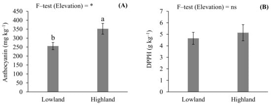 Anthocyanin concentration of the high-anthocyanin PES variety (A) and the DPPH activity of the high-antioxidant capacity KAK variety (B) grown at lowland and highland elevations. Data were analyzed by F-tests (* p < 0.05, ns: non−significant p < 0.05). Different letters indicate least significant differences (p < 0.05). The values of anthocyanin concentration and DPPH activity are expressed as mean ± SD (n = 4).