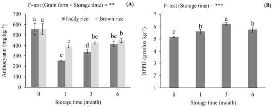 Anthocyanin concentration of the high-anthocyanin PES variety stored in paddy rice and brown rice forms for six months (A) and the DPPH activity of the high-antioxidant capacity KAK variety stored for six months (B). Data were analyzed by F-tests (** p < 0.01, *** p < 0.001). Different letters indicate least significant differences (p < 0.05). The values of anthocyanin concentration and DPPH activity are expressed as mean ± SD (n = 4).