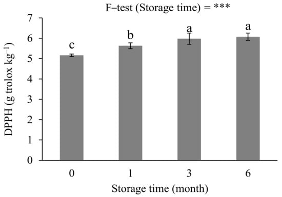 DPPH activity of the high-antioxidant capacity KAK variety stored in vacuum- and non-vacuum-sealed packages. Data were analyzed by F-tests (*** p < 0.001). Different letters indicate least significant differences (p < 0.05). The values of DPPH activity are expressed as mean ± SD (n = 4).