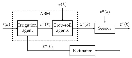 where is a nonlinear function, corresponds to the vector of state variables, w the vector of environmental inputs, the vector of management inputs (i.e., irrigation), and is the set of parameters related to the th agent, including soil, crop (e.g., type of cultivar), and management parameters. These parameters can be either constant or time varying. In general, they are known according to a probability distribution, e.g., the soil parameters are stochastic variables accounting for the soil variability.