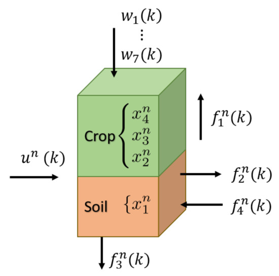 The discrete-time state space representation of a crop-soil agent (Equation (1)) becomes