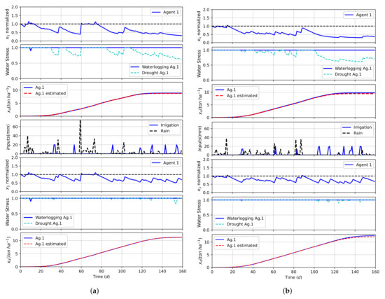 In this scenario, there is no exchange of water between agents. Instead, the root depth zone of every agent is chosen from a uniform distribution . The assignment of agents is presented in Figure 5. The value of is at field capacity for all agents. To assess the irrigation effect on every agent, the model runs first with no irrigation and then with the irrigation policy. For illustration purposes, only agent 1 is considered. All state variables are displayed in Figure 6 as all of them could be considered to make management decisions, i.e., for water use, to control the phenological development of the crop, to evaluate the effect of stress factors in crop transpiration, and to evaluate production. The estimator is working satisfactorily with a convergence time of about 30 days. , which is the only unmeasured variable, is estimated with a slight offset. The error of estimation of the biomass , which is used in our performance index to determine the irrigation policy, is ranging between 0.5 and 5% in the several simulation tests, see Table 1.