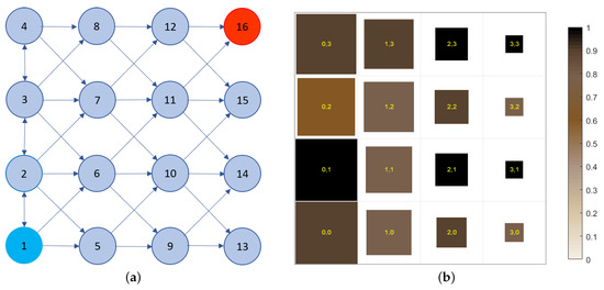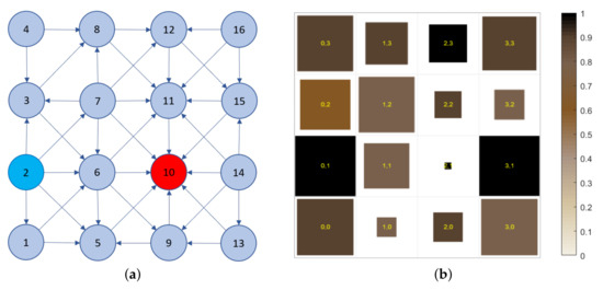 First scenario. (a) Aerial view of the land. (b) Grid representation after image processing. Here, the size of the side of every patch is 100 m and the coordinates identifier is depicted in the center of patches. The color of every patch indicates the normalized amount of water at time k, the darker means high water content and the lighter indicate dryness.