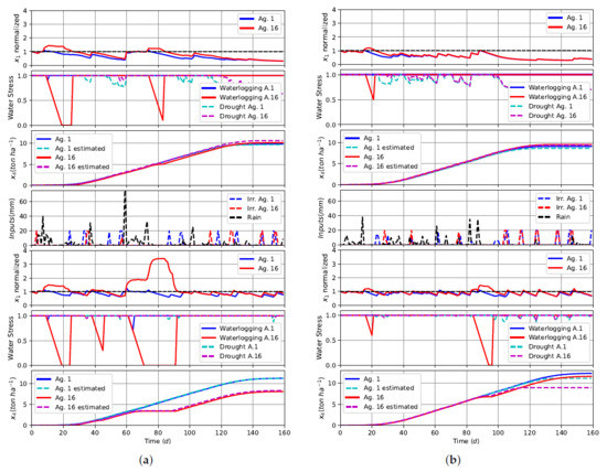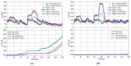 The trajectories of Agent 1 and 16 and their state estimates are shown in Figure 9 for state variables , and . The performance of the state estimator is satisfactory for agent 1, but the estimation of the water content of agent 16 suffers from transient errors particularly in periods of strong rainfall, where the water content is underestimated. The tuning parameter can be used to partly alleviate this situation, but is not enough to guarantee a good estimation in all cases. After irrigation, state decreases as a result of the reduction in the drought stress and the increase of the crop transpiration.