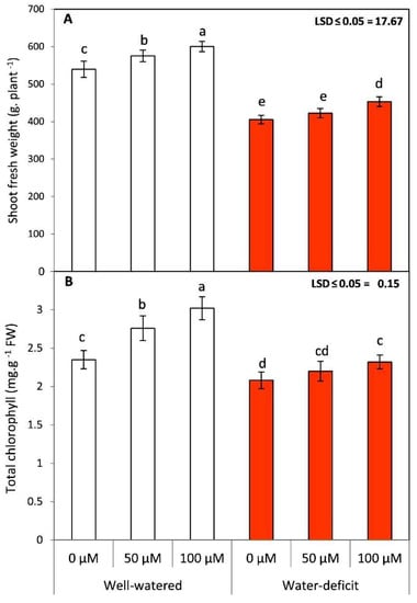 Tomato plants subjected to deficit irrigation exhibited a significant (p ≤ 0.05) reduction in shoot fresh weight (Figure 1). In the present work, chlorophyll and lycopene contents exhibited an opposite trend in the presence and absence of the SNP treatment in tomato plants (Figure 1 and Figure 2). Water stress triggered a significant decrease in total chlorophyll content in comparison with in the WW plants. The application of SNP (50 and 100 µM) triggered a partial increase in total chlorophyll content, which was, however, higher in well watered conditions (Figure 1). Generally, the leaf spraying with SNP exhibited more healthy growth with a significantly higher chlorophyll content in comparison to in the untreated plants in both seasons.