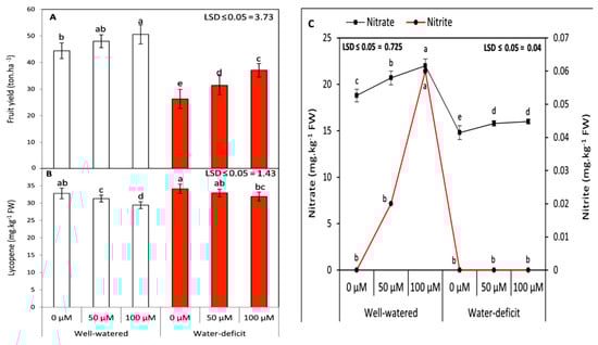 Effects of SNP as foliar applications at 0, 50, and 100 µM on the fruit yield (A) and its contents of lycopene (B) as well as nitrite and nitrate (C) of tomato plants grown under well-watered and water deficit irrigation. Data followed by the same letters are not significantly different using the LSD multiple rang test at a 5% level.