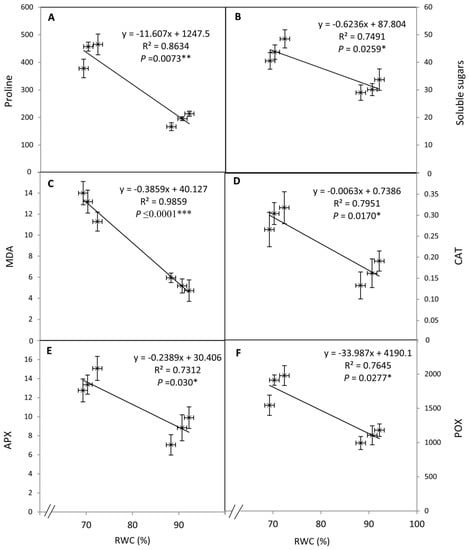 The regression analysis revealed that the osmolyte content (proline and soluble sugars) and antioxidant enzyme activity (CAT, APX, and POD) exhibited an inverse correlation with the increase in RWC under both irrigation regimes (Figure 5A–F). Thus, the reduction in RWC due to osmotic stress was significantly correlated with an increase in osmolyte content and elevation in antioxidant enzymes’ activity during WD stress.