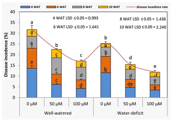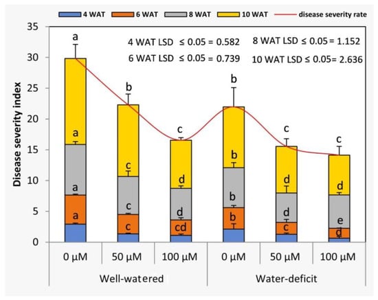 Under the water stress conditions, the viral disease severity indices of tomato plants were significantly (p ≤ 0.05) decreased at different growth stages (4, 6, 8, and 10 WAT) when compared to those of the well-irrigated plants in both seasons (Figure 7). The results indicated that the increase in viral disease severity index coincided with the rise in the age of plants. Generally, the treatment of SNP at 100 µM resulted in lower rates of viral disease severity index compared to those of the untreated plants at different growth stages in both seasons.