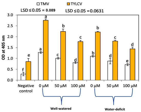- Serologically: Enzyme-linked immunosorbent assay [32] was used to determine TSWV levels in sap of young leaves of infected tomato plants 30 days postinoculation (dpi). Absorbance values were determined using an ELISA reader (BIE & BERNTSEN AS) at 405 nm for 1 h.