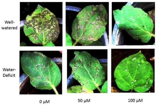 The average number of local lesions of TMV was evaluated biologically in the second season (Figure 9). The cell sap of the infected tomato plants in the field from SNP treatments under both levels of irrigation was taken as a source of infection on N. glutinosa in a greenhouse under controlled conditions. After seven days from inoculation, the number of local lesions appeared higher as a result of the inoculation with the cell sap of the WW than that in those under the WD conditions. Furthermore, the foliar application of 100 µM SNP demonstrated a decrease in the number of local lesions. These results indicated that NO at an appropriate concentration might likely reinforce the tolerance of tomato plants to viral diseases.