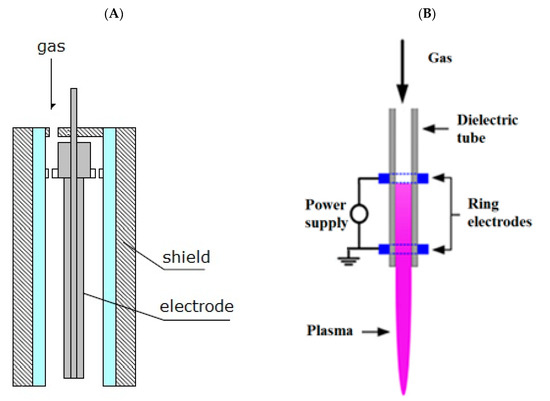 Schema of atmospheric pressure plasma jets: RF-type (A), DBD-type (B) [104,118].