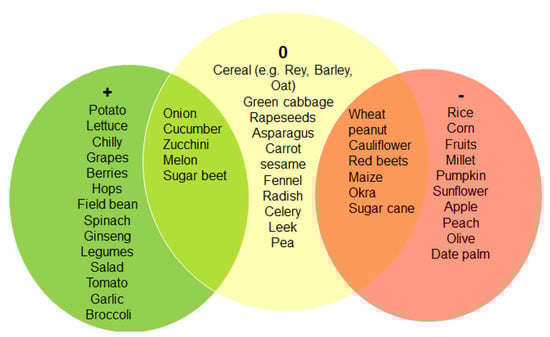 Crops that perform better with shading are put under the “+” category (green), whereas the shade-intolerant crops are under “−” (red). The crops under the “0” category are indifferent to shade when the overall crop yield is considered. Although this categorization gives a first overview of crops selection, it might not apply to all the locations around the globe. Field experiments are necessary to verify this.