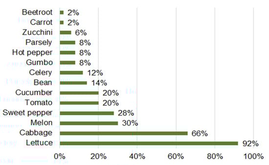Besides the cereals mentioned above, people in the areas close to the Niger River also produce many vegetables as cash crops. The study [37], in the suburb of Niamey, identified the production of many vegetables and their frequency of farming shown in Figure 3. This information, together with the field survey at the case study site, has been used to select the top five cash crops for the economic analysis in this study.