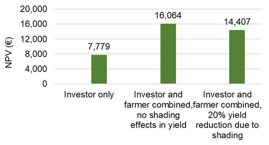 One further aspect of the negative shading effect on agricultural yield has also been considered. Crop production in this shading case is assumed at about 80% of the normal production. This reduction has an impact on the farmer’s revenue. As expected, the combined NPV values are higher than in the individual case, even after considering the mentioned shading effect. The combined NPV values are compared in Figure 7.