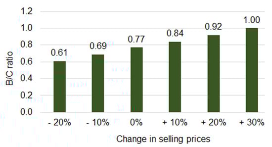 The price fluctuation of the cash crop can be much higher than currently expected. Therefore, a sensitivity analysis is carried out to observe the influence of selling price changes on the B/C ratio in (Figure 8). The results show that to reach the farming system B/C ratio to 1, the average selling price for all crops shall increase at least by 30%, which is currently not realistic.