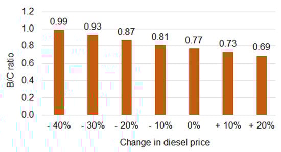 The diesel price might vary in the market from the currently taken price of 0.76 €/L. Cost for diesel has a significant share in total cost, therefore the sensitivity analysis is carried out to observe the impact of diesel price variations on the B/C ratio. Results are presented in Figure 9. It can be interpreted that the diesel price shall drop below 40% from its current level to be the farming system at cost breakeven point. This scenario is also not realistic looking at the overall trends of rising petroleum prices in recent years.