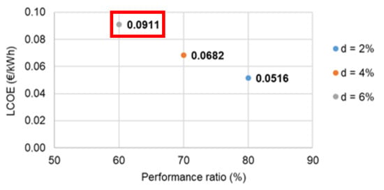 The calculated value of LCOE is at 9.11 €ct/kWh (with the energy yield discounted to its present value at a baseline discount rate of 6%). When the lesser discount rates e.g., 2% or 4%, and higher performance ratio (e.g., 70% or 80%), are considered, corresponding LCOE values will be lower, as shown in Figure 10.
