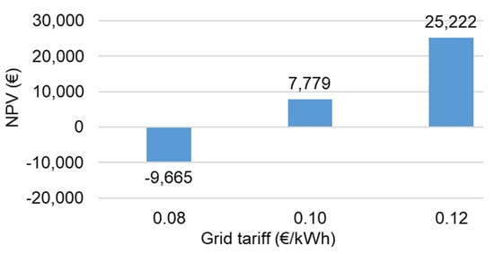 On the revenue side, the most important parameter is the electricity selling tariff. Therefore, its influence on the NPV is calculated and the results are presented in Figure 11. If the selling tariff goes below 0.0911 €/kWh, the NPV will start to get negative. Therefore, this is the breakeven selling tariff.