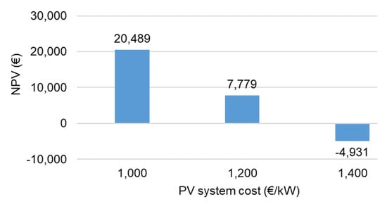 On the cost side, the PV system cost is the most important parameter that determines the total system cost. The influence of change in PV system costs on the NPV is shown in Figure 12. It is expected that the solar systems will be cheaper in the coming years (if they follow the trend of the recent past). In that case, the APV system seems further promising.