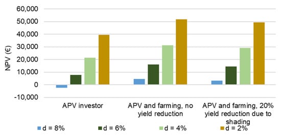 The results presented above in Figure 8 are based on the assumed value of a discount rate of 6% [45]. For APV projects with a long lifetime, the selection of the correct discount rate is important. A high discount rate leads to a smaller value of NPV as well as a higher value of LCOE. Figure 13 shows the calculated values of NPVs under the different scenarios for discount rates.