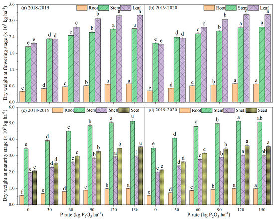 As P rate increased, the biomass accumulation in different organs significantly increased (Figure 1). For example, at flowering stage, as compared with CK, the treatment of 120 kg P2O5 ha−1 increased the biomass accumulations of root, stem, and leaf by, on average, 63.77%, 28.83%, and 49.39% over two growing seasons. At maturity stage, these increments in the biomass accumulations, under the 120 kg P2O5 ha−1, treatment were, on average, 71.05% for root, 47.03% for stem, 51.11% for shell, and 68.24% for seed, respectively.