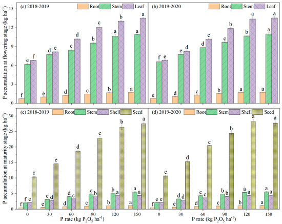 Effects of P rate on P accumulation of canola plants in a saline environment. (a,b): P accumulation at flowering stage during 2018–2019 and 2019–2020 growing seasons. (c,d): P accumulation at maturity stage during 2018–2019 and 2019–2020 growing seasons. Different letters indicate significant difference at p = 0.05 between P rate treatments for the same plant organ.