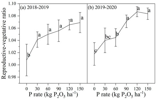 In addition, P supply enhanced the reproductive-vegetative ratio at maturity stage. The reproductive-vegetative ratio was increased by 6.69%, with the P rate increasing from 0 to 120 kg P2O5 ha−1 during the 2019–2020 growing season. Although there was no significant difference among 30–150 P2O5 kg ha−1 treatments during the 2018–2019 growing season, the reproductive-vegetative ratio still showed an increasing tendency (Figure 3).