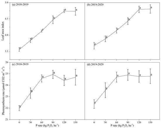 Effects of P rate on leaf area index and photosynthetic rate of canola plants in a saline environment. (a,b): leaf area index at flowering stage during the 2018–2019 and 2019–2020 growing seasons. (c,d): leaf photosynthetic rate at the flowering stage during the 2018–2019 and 2019–2020 growing seasons. Different letters indicate significant difference at p = 0.05 between P rate treatments.