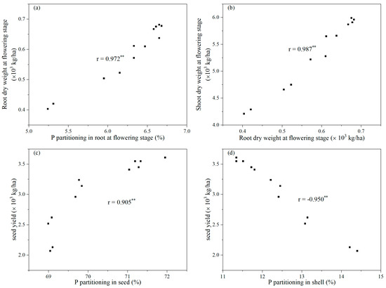 Correlation between some parameters in this study. (a): the relationship between P partitioning in root, and root dry weight, at the flowering stage. (b): the relationship between root dry weight and shoot dry weight (stem and leaf) at the flowering stage. (c): the relationship between P partitioning in seed and seed yield. (d): the relationship between P partitioning in shell and seed yield. ** p < 0.01.